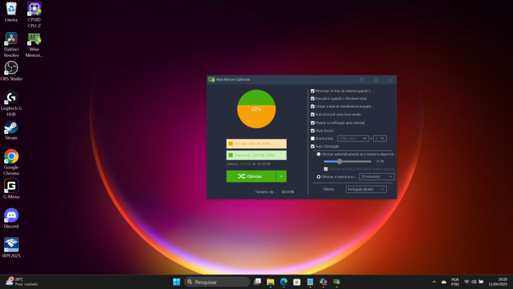 1. Otimizar a memória: Clique no botão “Otimizar Agora”. O programa irá analisar a utilização da memória RAM e liberar espaço ao fechar processos que não estão em uso ativo.